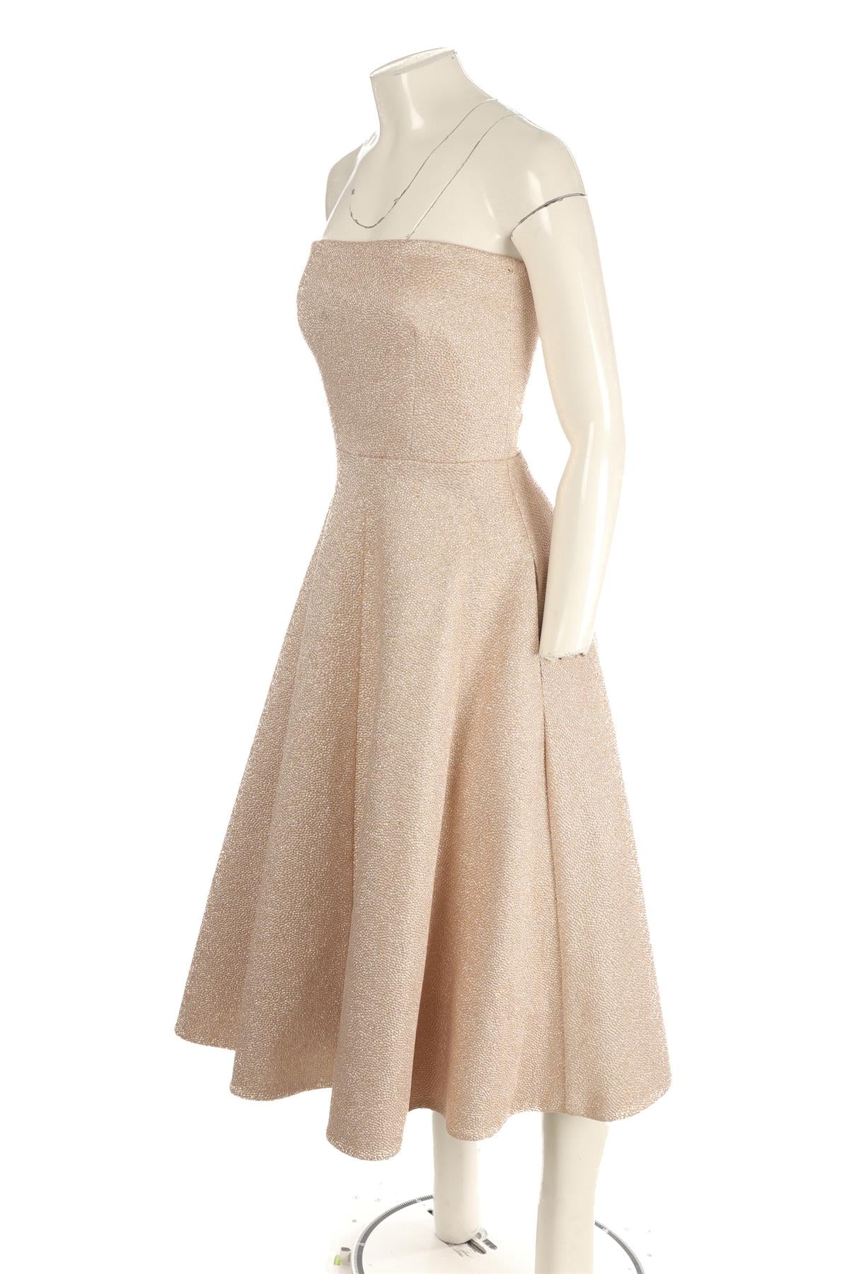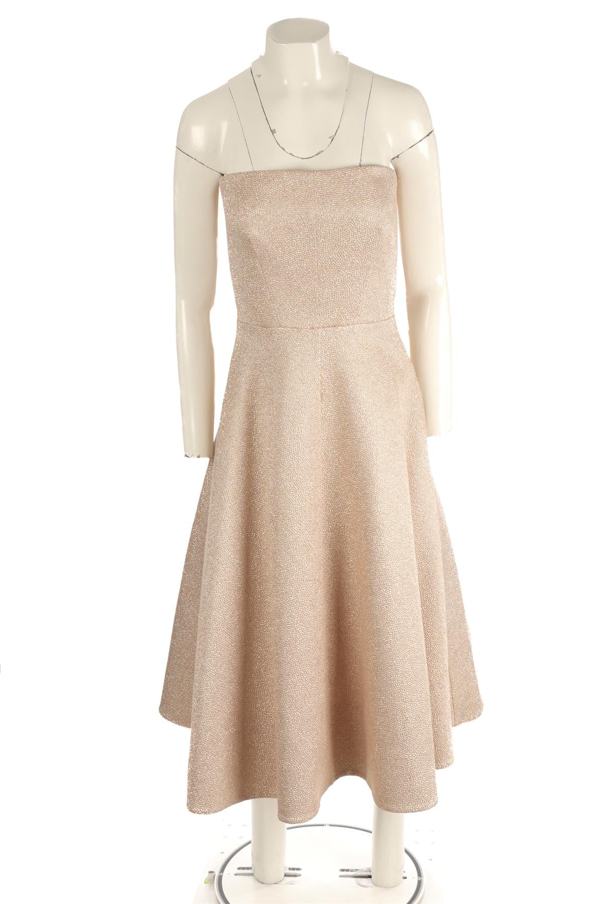Rochas Pink Jacquard Midi Dress. Pink. Sleeveless. Sweetheart. Zip fastening - Back. No composition label. No size label. UK 10 (US 6, FR 38, IT 42). Bust: 30 in. Waist: 26 in. Hips: 42 in. Length: 40 in.