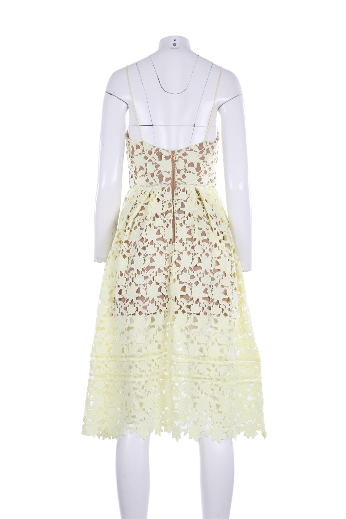 Self-Portrait Yellow Crochet Midi Dress. Yellow. Sleeveless. Sweetheart. Zip fastening - Back. 100% Polyester, 95% Polyester, 5% Spandex. UK 10 (US 6, FR 38, IT 42). Bust: 28 in. Waist: 26 in. Hips: 40 in. Length: 31 in.