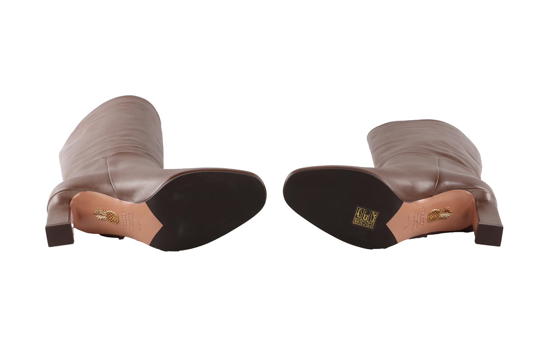 Aquazzura Brown Leather Knee High Boots. Brown. Pull on. Does not come with - dustbag or box. EU 38.5 (UK 5.5, US 8.5). Insole: 10 in. Heel Height: 3.5 in.