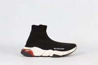 Balenciaga Black Speed Knit Sneakers. Black. Pull on. Does not come with - dustbag or box. EU 38 (UK 5, US 8). Insole: 9.75 in. Heel Height: 1.5 in.