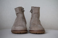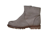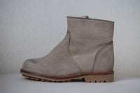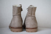 Girls' beige suede Bonpoint ankle boots with round toes, shearling at interior, tonal stitching throughout, stacked heels and concealed zip closures at back.