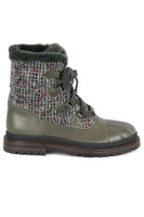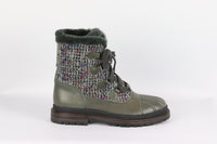 - Chanel 2016 shearling lined tweed and leather ankle boots.