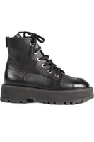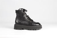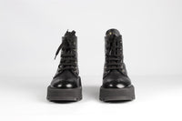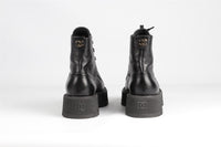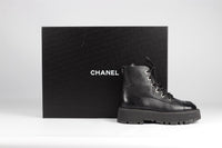 Chanel Black Leather Ankle Boots. Black. Lace up fastening - Front. Comes with - box. EU 38.5 (UK 5.5, US 8.5). Insole: 11 in. Heel Height: 2 in.