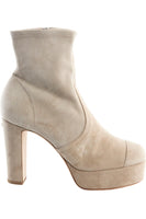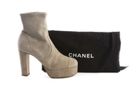 Chanel Grey 2024 Suede Platform Ankle Boots. Grey. Zip fastening - Side. Comes with - dustbag. Insole: 10 in. Heel Height: Platform: 1.5 in Heel: 3.75 in.