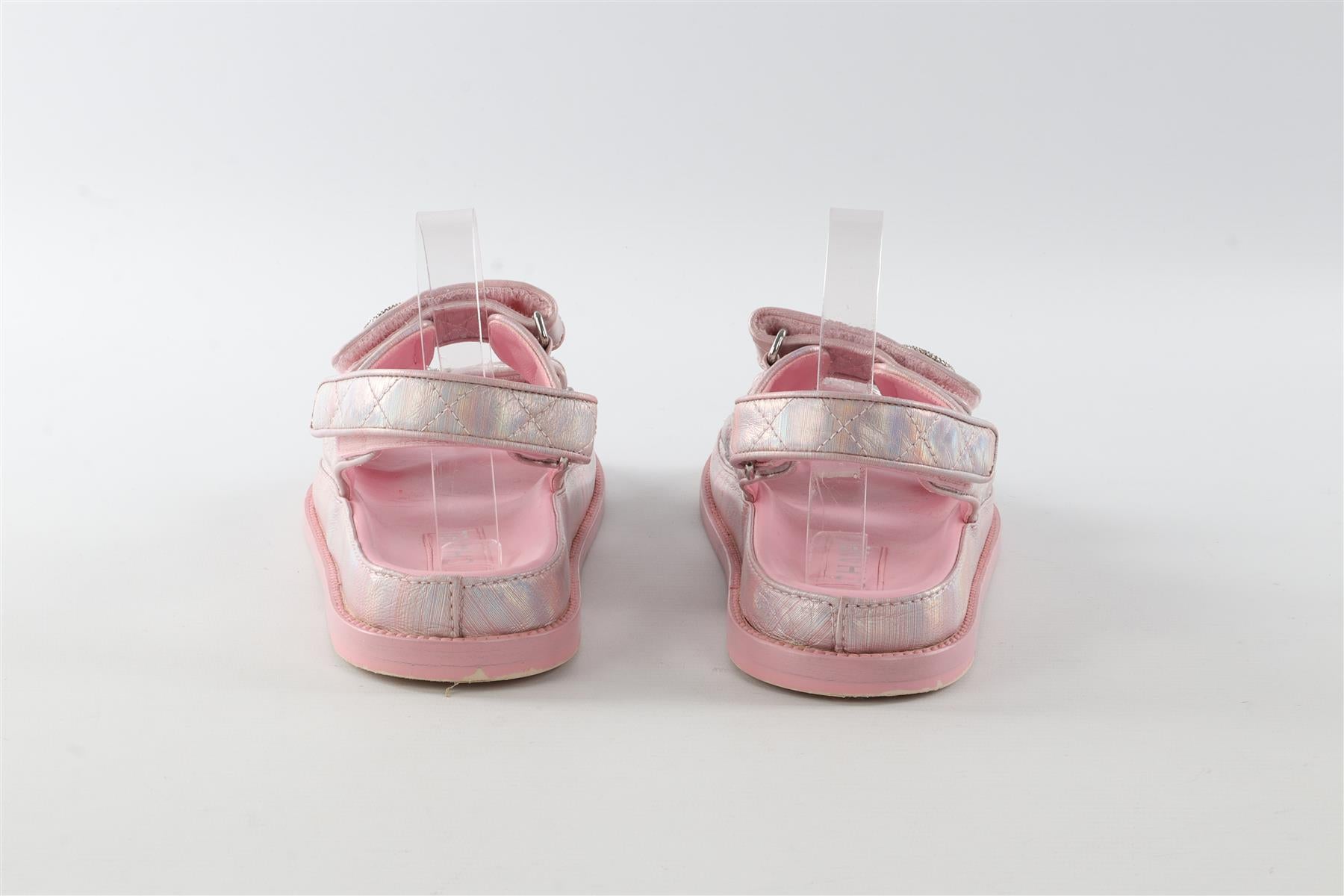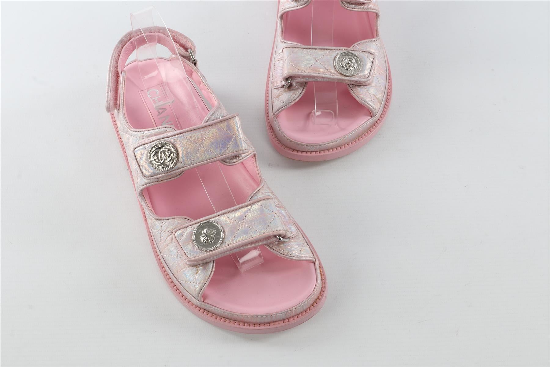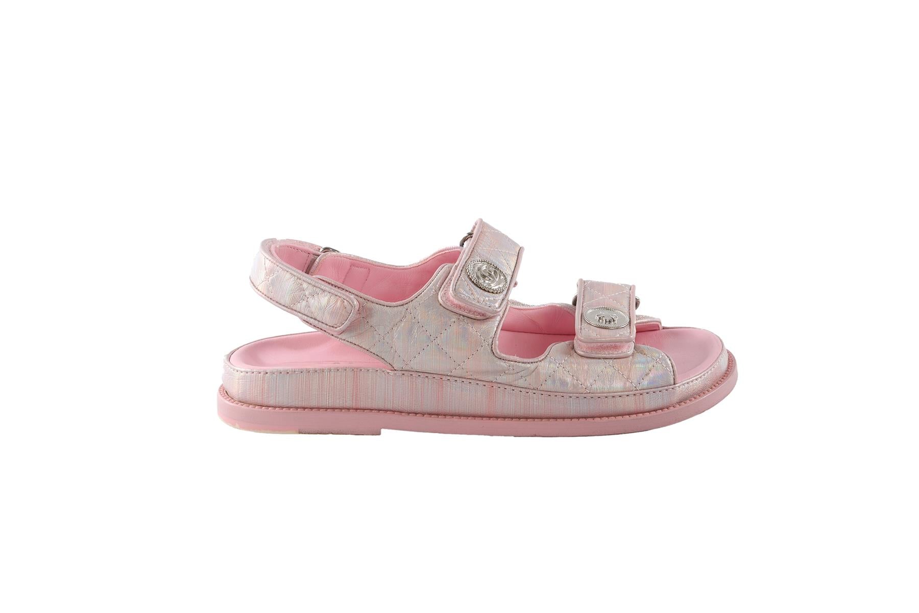 Chanel Pink 2022 Dad Quilted Leather Sandals. Pink. Slips on. Does not come with - dustbag or box. EU 38 (UK 5, US 8). Insole: 10 in. Heel Height: 1.2 in.