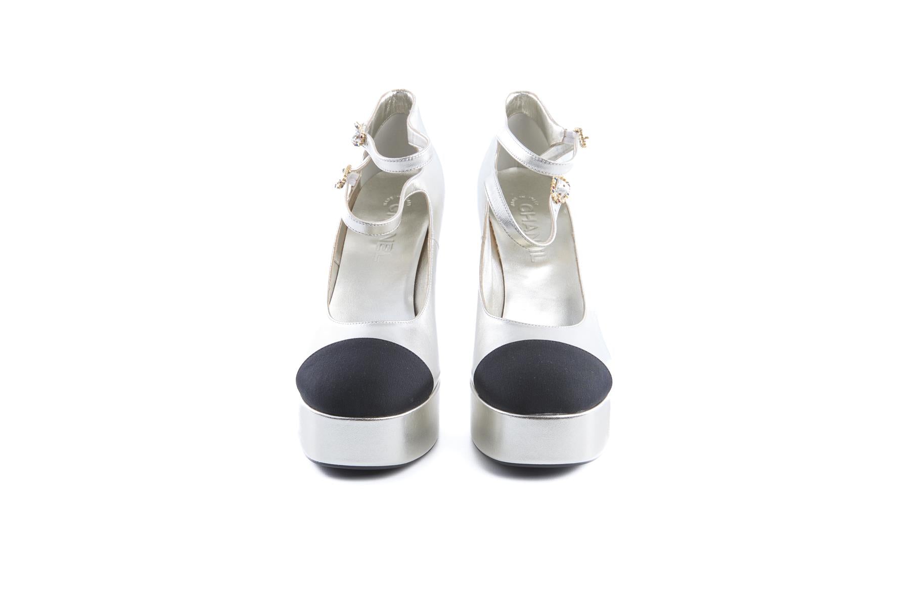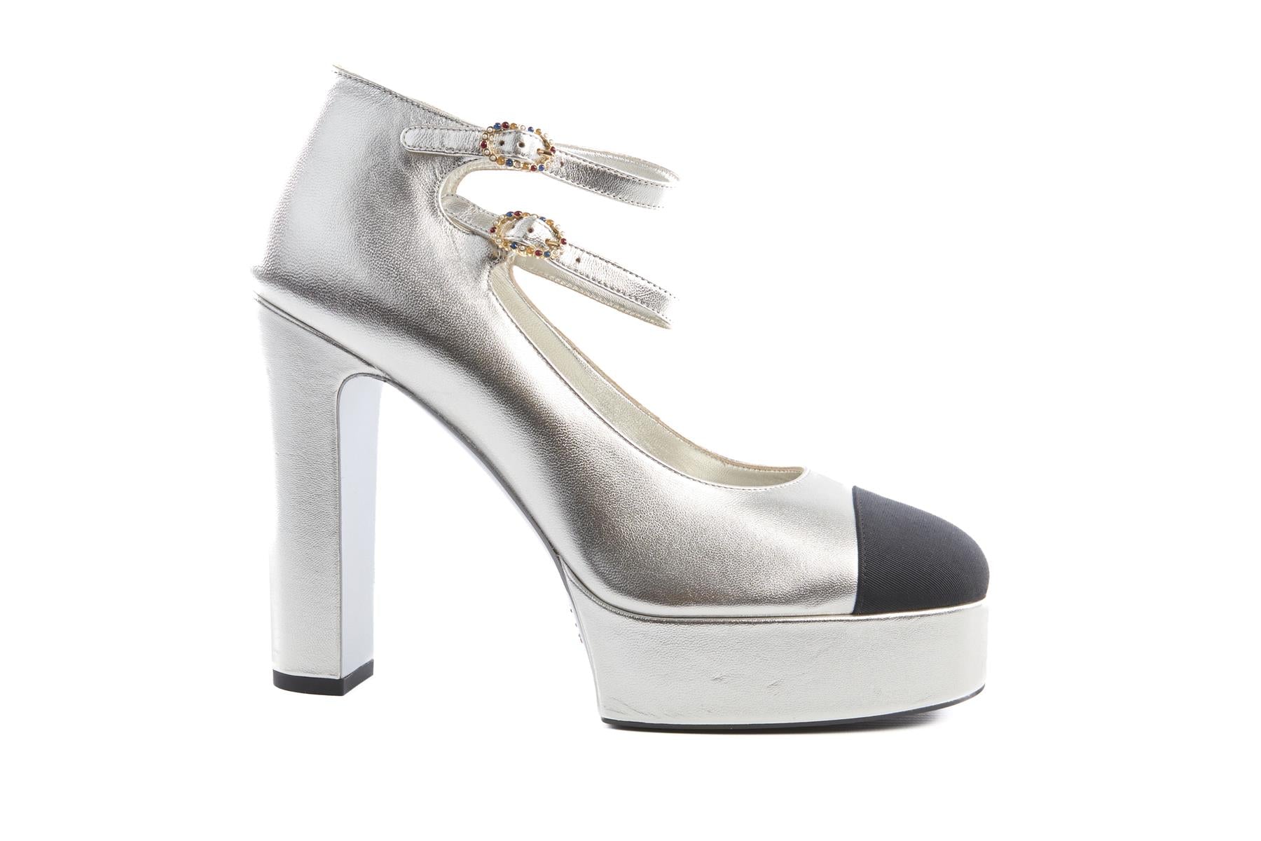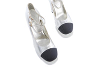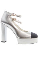 Chanel Silver 2025 Leather Platform Pumps. Silver and black. Buckle fastening - Side. Does not come with - dustbag or box. Insole: 10 in. Heel Height: 4.5 in.