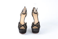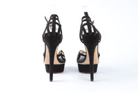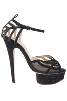 Charlotte Olympia Black Suede Platform Sandals. Black. Buckle fastening - Side. Does not come with - dustbag or box. EU 36 (UK 3, US 6). Insole: 9.1 in. Heel Height: 5.5 in.