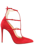 Christian Louboutin Red Suede Pumps. Red. Buckle fastening - Side. Comes with - dustbag. EU 38 (UK 5, US 8). Insole: 9.8 in. Heel Height: 4.5 in.