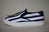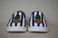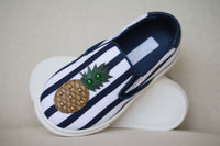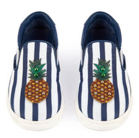Girls blue & white stripe slip-on shoes from Dolce & Gabbana, with pineapple appliqués on the front.