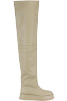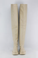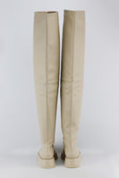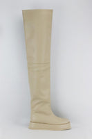- Made from soft beige faux-leather in an over-the-knee design with rubber platform sole.
