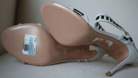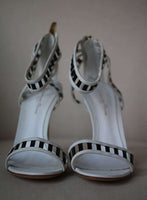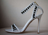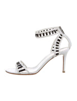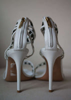 White leather sandals with black leather detail on the toe and ankle strap. Zip fastened at the rear. Stiletto heels. 100% Lambskin leather.