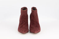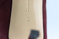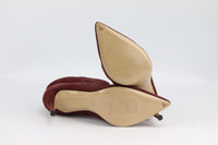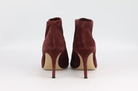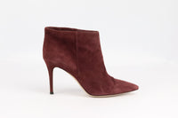 - Made from burgundy suede with pointed toe and slight heel.