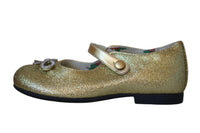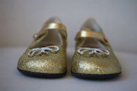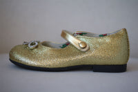 - Girls gold glitter ballerina shoes by Gucci, with crystal metal bows, a rose print lining and luxurious gold piping.