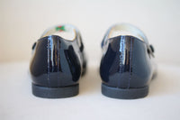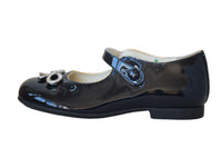- Girls navy blue ballerina shoes by Gucci, with crystal metal bows, a rose print lining and luxurious gold piping.