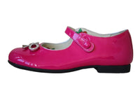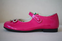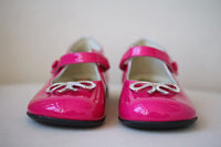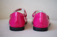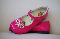 - Girls bright pink ballerina shoes by Gucci, with crystal metal bows, a rose print lining and luxurious gold piping.