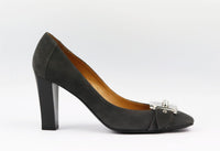 - These pumps by Hermès are a classic style that will never date, made in Italy from supple grey suede, they have square toes and silver-tone buckle detail that can be seen throughout Hermès collections.