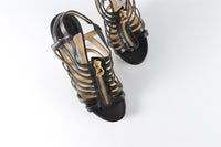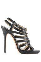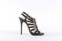 Jimmy Choo Black Leather Sandals. Black. Zip fastening - Front. Does not come with - dustbag or box. EU 39 (UK 6, US 9). Insole: 10 in. Heel Height: 5 in.
