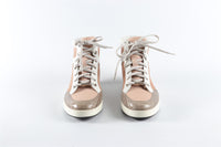 Jimmy Choo Nude Suede And Leather Sneakers. Nude. Lace up fastening - Front. Does not come with - dustbag or box. EU 38 (UK 5, US 8). Insole: 10 in. Heel Height: 0.9 in.