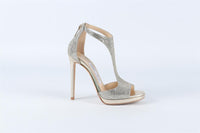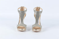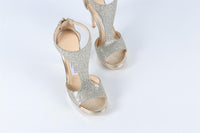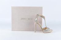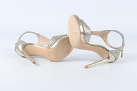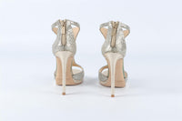 Jimmy Choos Silver Glitter Sandals. Gold. Zip fastening - Front. Comes with - box. EU 34 (UK 1, US 4). Insole: 8.45 in. Heel Height: 3.65 in.