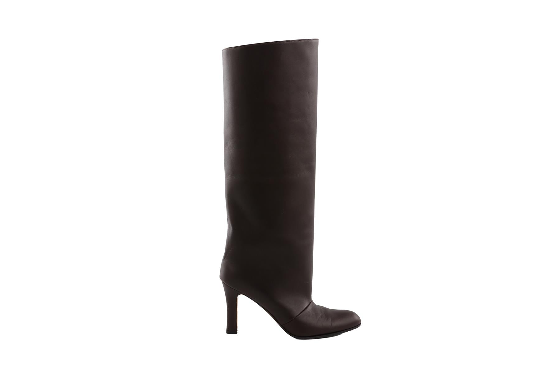 Manolo Blahnik Brown Leather Knee High Boots. Brown. Pull on. Does not come with - dustbag or box. EU 38.5 (UK 5.5, US 8.5). Insole: 10 in. Heel Height: 3.5 in.