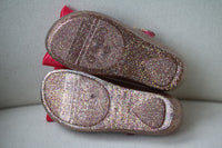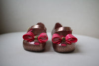 - Girls pink and gold glittery, sweet scented jelly shoes by Mini Melissa.