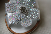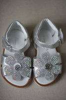- They have leather uppers and lining with a velcro ankle strap and a diamante embellished flower on the front.