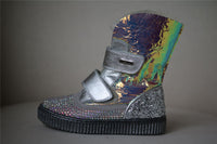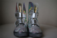 - Designed by Italian brand, Missouri, the metallic silver uppers are decorated with diamanté and glitter.