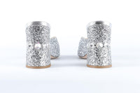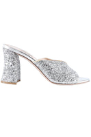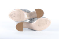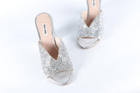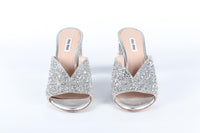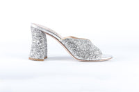 Miu Miu Silver Glitter Mules. Sliver. Slips on. Comes with - dustbag. EU 37 (UK 4, US 7). Insole: 9.5 in. Heel Height: 3.5 in.