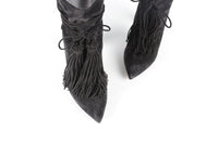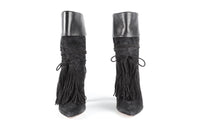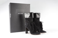 Saint Laurent Black Suede Ankle Boots. Black. Tie fastening - Front. Comes with - dustbag and box. EU 39.5 (UK 6.5, US 9.5). Insole: 10.5 in. Heel Height: 4.2 in.