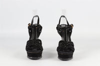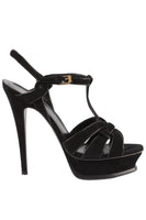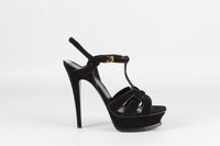 Saint Laurent Black Tribute Suede Platform Sandals. Black. Buckle fastening - Side. Does not come with - dustbag or box. EU 38.5 (UK 5.5, US 8.5). Insole: 10 in. Heel Height: 4.30 in.