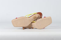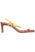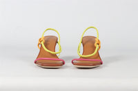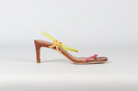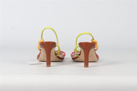 Staud Leather Sandals. Brown, Pink and Lime. Slips on. Does not come with - dustbag or box. EU 37.5 (UK 4.5, US 7.5). Insole: 9.75 in. Heel Height: 2.5 in.