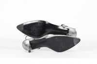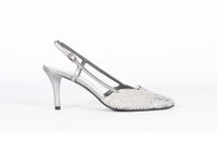 Stuart Weitzman Vintage Lace And Leather Slingback Pumps. Silver. Buckle fastening - Side. Does not come with - dustbag or box. EU 37 (UK 4, US 7). Insole: 9.7 in. Heel Height: 3.2 in.