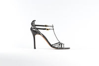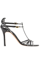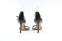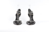 Versace Black Crystal And Suede Sandals. Black. Buckle fastening - Side. Does not come with - dustbag or box. EU 38 (UK 5, US 8). Insole: 9.75 in. Heel Height: 4 in.