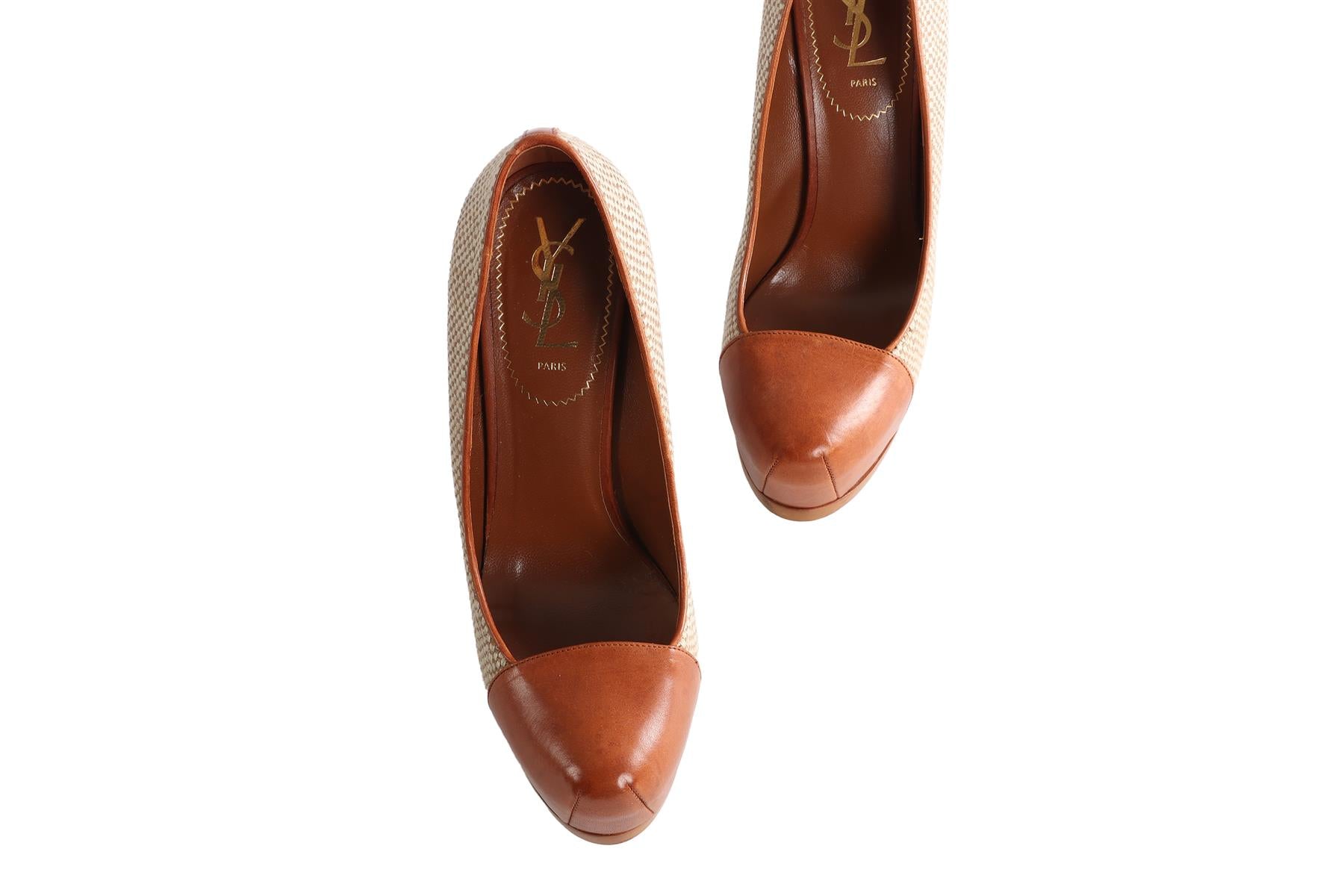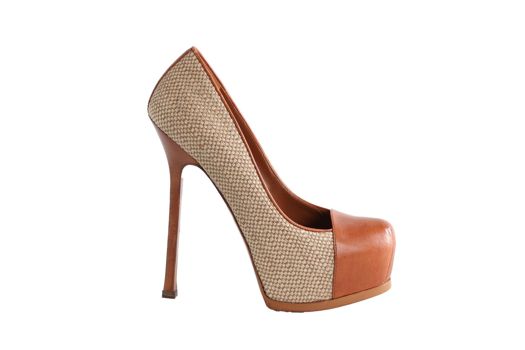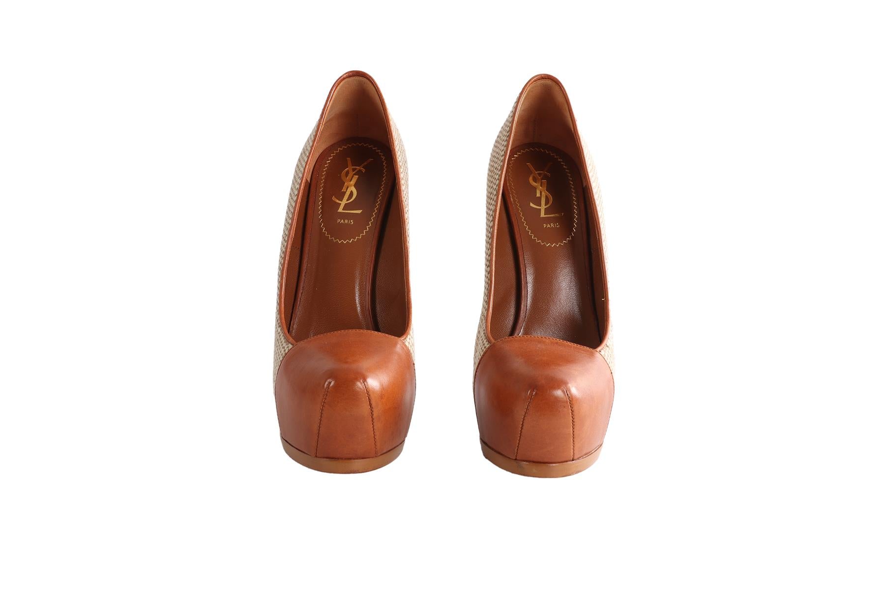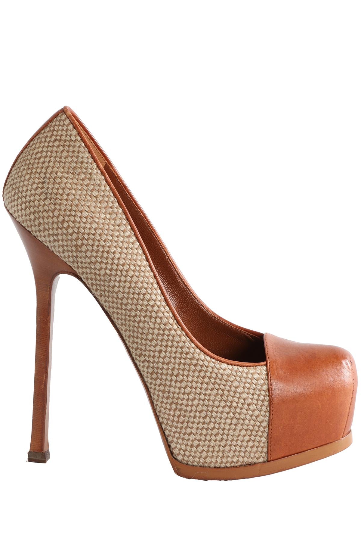 Yves Saint Laurent Tan Canvas Platform Pumps. Tan. Slips on. Does not come with - dustbag or box. EU 38.5 (UK 5.5, US 8.5). Insole: 9.5 in. Heel Height: 6 in.