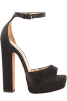 Jimmy Choo Black Satin Platform Sandals. Black. Buckle fastening - Side. Does not come with - dustbag or box. EU 38 (UK 5, US 8). Insole: 9.25 in. Heel Height: 4.5 in.
