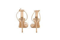 Jimmy Choo Gold Satin Sandals. Gold. Buckle fastening - Side. Does not come with - dustbag or box. EU 38 (UK 5, US 8). Insole: 9.5 in. Heel Height: 4.5 in.