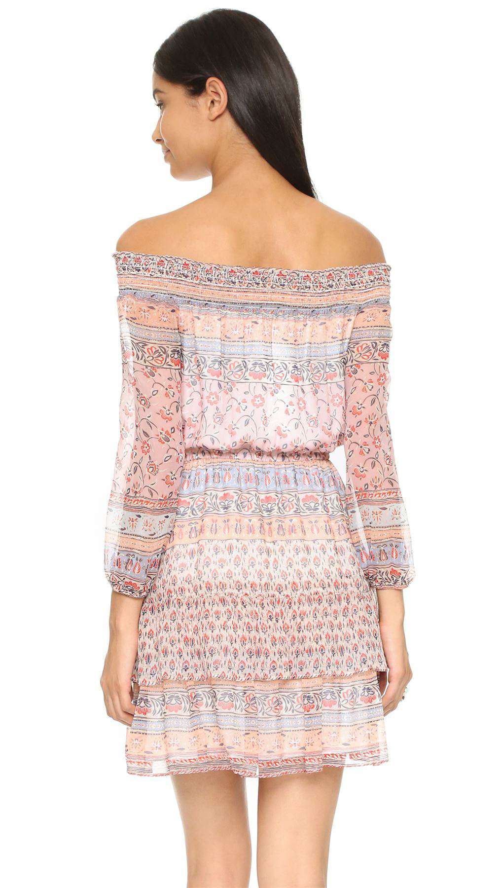 A prairie-inspired Shoshanna dress crafted in calico-print silk gauze. Covered elastic at the off-shoulder neckline, waistband, and cuffs. Lined. Fabric: Silk gauze. Shell: 100% silk. Lining: 100% polyester.