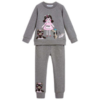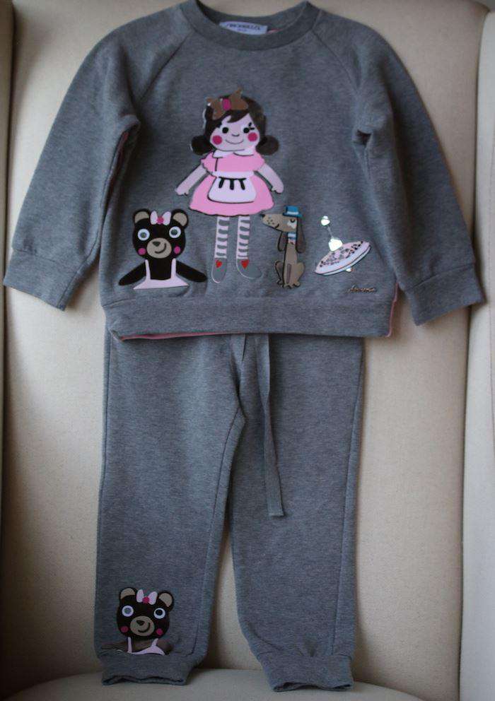 This cosy and comfortable luxury tracksuit for girls is designed by Simonetta. Made in soft sweatshirt jersey, the top has a round neckline, and character appliqué on the front, with a fleece lining. The matching trousers have a drawstring waistband, side pockets and a fleecey lining for comfort and warmth.