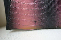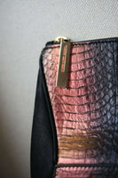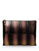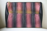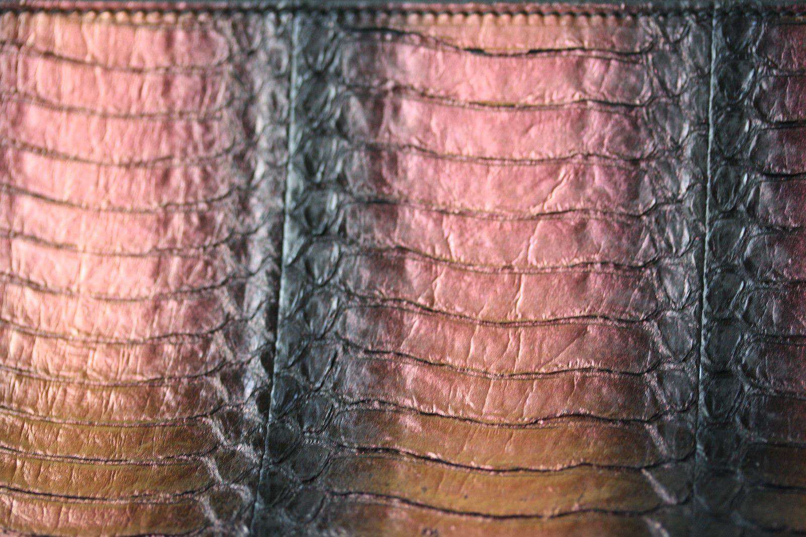 This zip clutch bag is classic understated elegance with a contemporary geometric design. The main body of iridescent metallic two-tone python is caressed by the smoothest Nubuck leather in a complementary shade of black. The clutch is fastened at the top with a 24k gold plate zip. As beautiful within, the bag is lined with elegant and supple black leather.