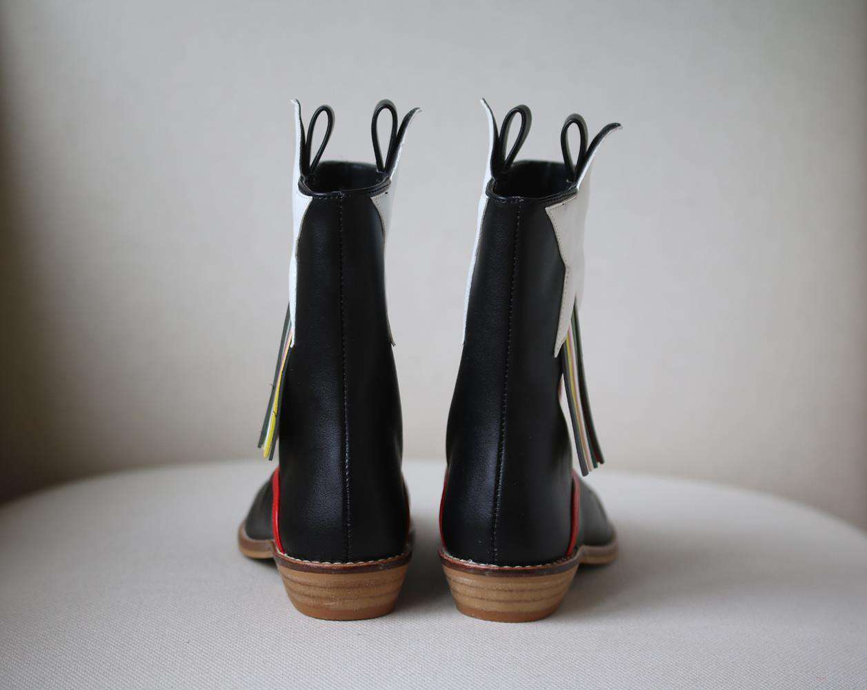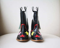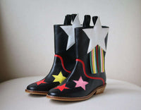 • These pull-on, mid-calf length boots have colourful stars in red, pink, yellow and white with matching fringing on the sides and red trim.