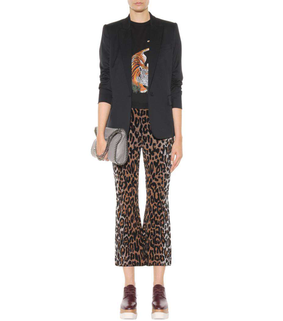 Give your new-season wardrobe a bold finish with these statement-making trousers from Stella McCartney. Knitted with a leopard motif in a fitted-then-flared shape, they will give any blouse a punchy finish. Style yours with platform shoes to highlight the cropped length. Elasticated waist. 50% viscose, 35% wool, 15% polyamide. Waistband: 56% wool, 24% silk, 18% polyamide, 2% elastane.
