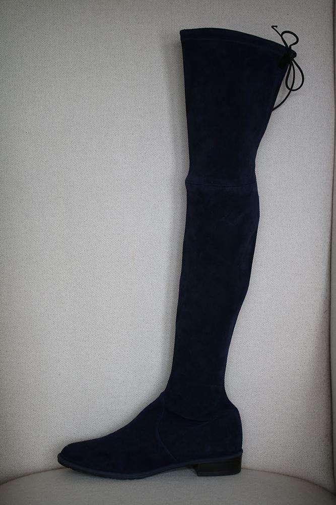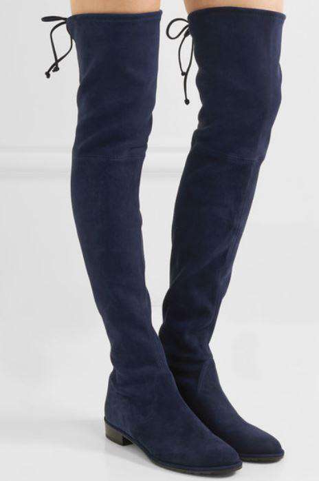 Stuart Weitzman's 'Lowland' boots have been a cult hit since Gisele Bündchen wore them in the brand's Fall '15 campaign, shot by Mario Testino. Made from supple suede, this navy pair has an over-the-knee shape that's held in place by leather ties. Heel measures approximately 20mm/ 1 inch. Light-grey suede. Pull on. Designer color: Navy. Made in Spain.
