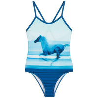 Sunuva girls blue swimsuit with a pretty horse print on the front. Made from smooth and stretchy fabric that has UV sun protection of 50+ to protect delicate skin.
