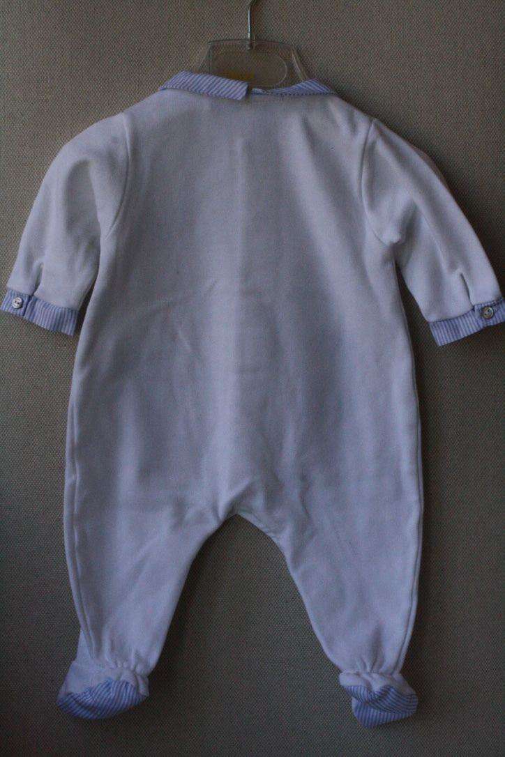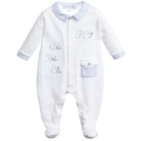 White babygrow made in a soft cotton jersey with a soft fleece feel inside. It has blue and white striped cotton collar, pocket, cuffs and soles of feet. It has blue embroidered A, B, C motifs and designer initials on the front. It fastens down the front with one mother of pearl button and concealed poppers and has popper fasteners between the legs making nappy changes easier.