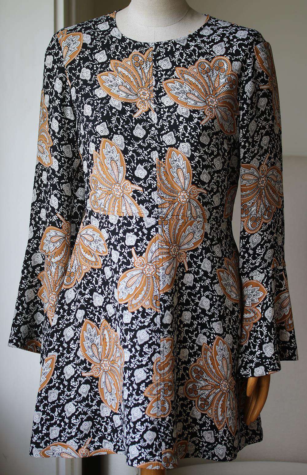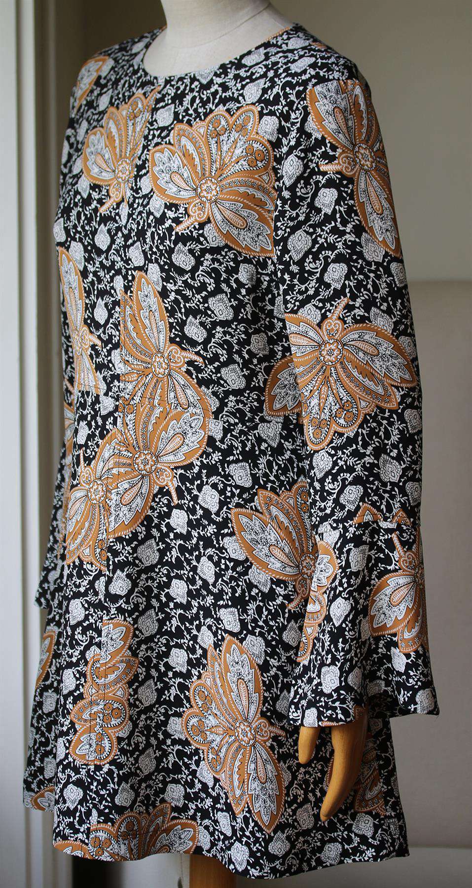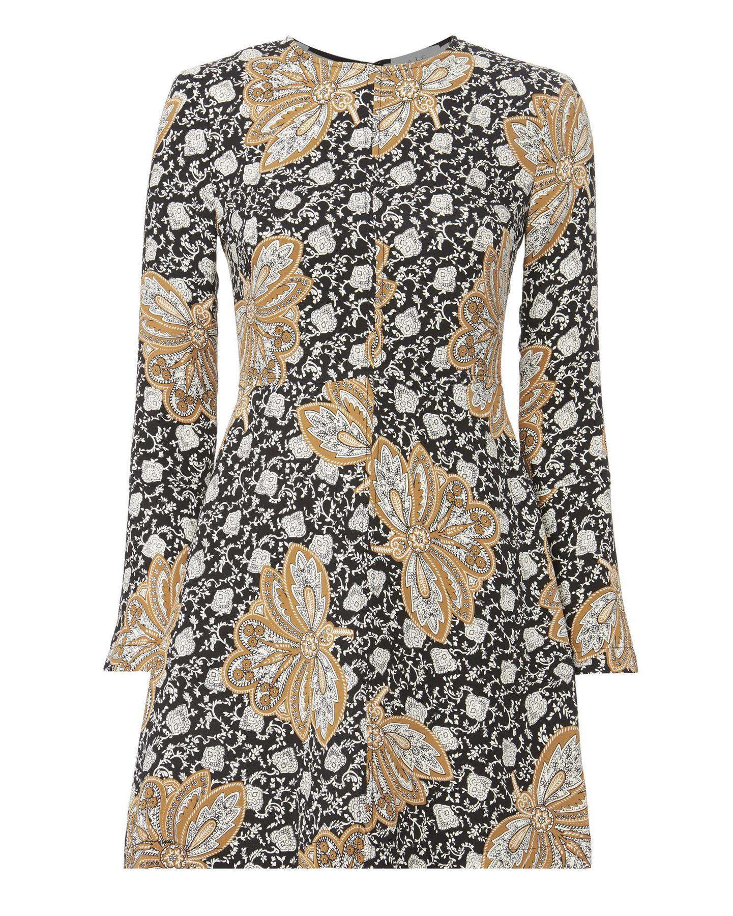 A simple, fitted A.L.C. dress in richly printed silk. Slim, long sleeves and gently flared cuffs. Crew neckline. Hidden back zip. Unlined. Fabric: Silk crepe. 100% silk.