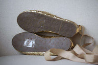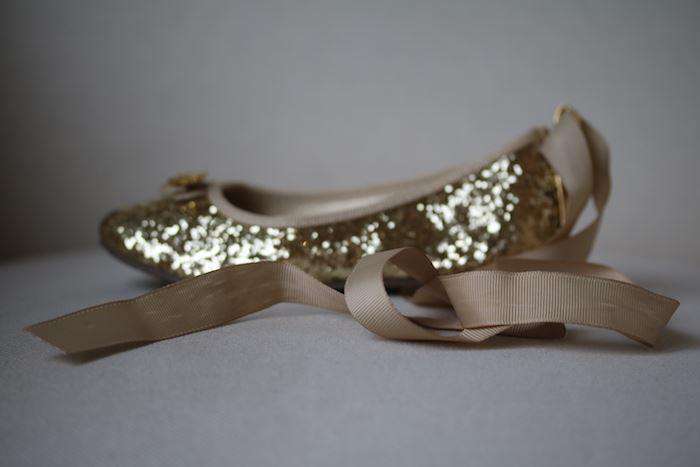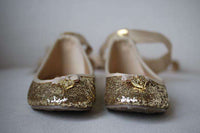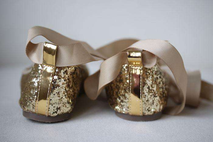 Girls gold glitter ballerina shoes from Angel's Face. The outer shoe and lining are made in fabric, with a faux leather insole and non-slip rubber outer sole. They have a pretty bow and charm on the front, with removable ribbon ties that can be worn around the ankles.