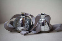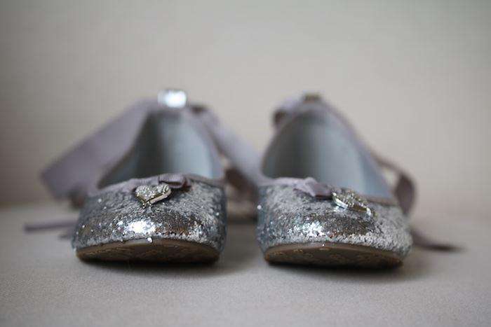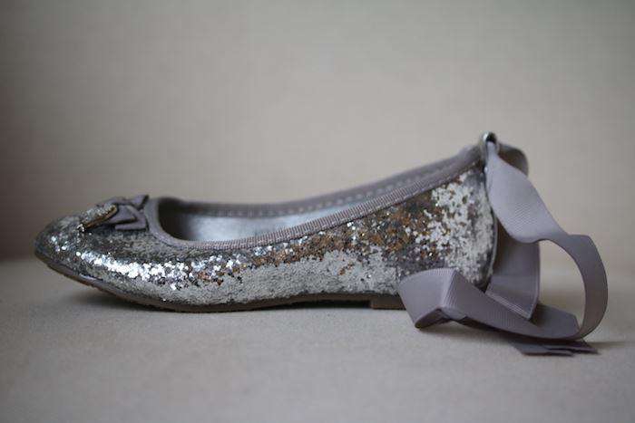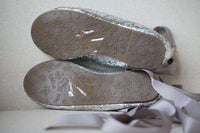 Girls silver glitter ballerina shoes from Angel's Face. The outer shoe and lining are made in fabric, with a faux leather insole and non-slip rubber outer sole. They have a pretty bow and charm on the front, with removable ribbon ties that can be worn around the ankles.