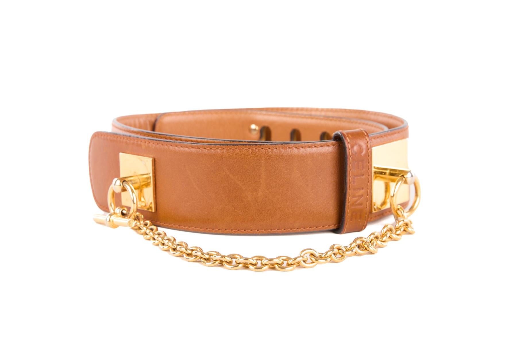 Celine Tan Vintage Leather Waist Belt. Tan. Twist lock fastening - Front. Does not come with - dustbag or box. 65 cm. Length: 26-27.5 in. Width: 1.5 in.
