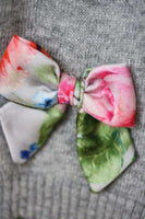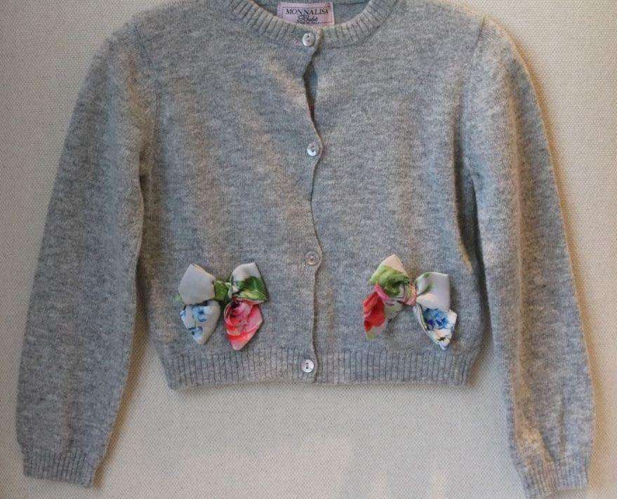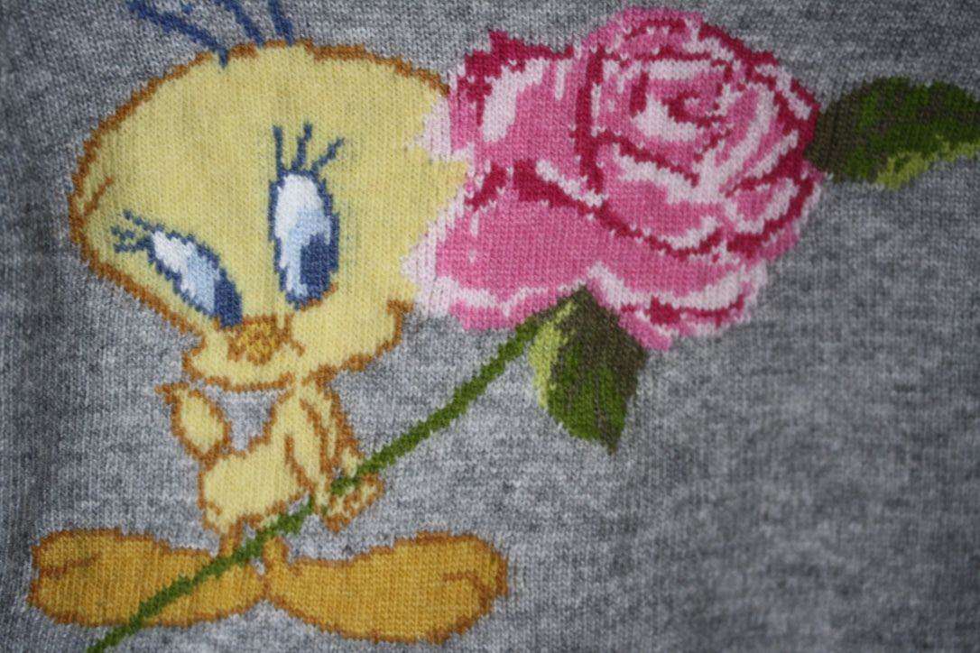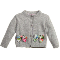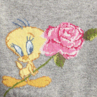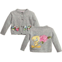 Grey softly knitted cardigan made from a wool blend with angora and cashmere. It fastens with little buttons at the front and has a cute Tweety Pie image knitted into the back. The front has two little floral satin bows.