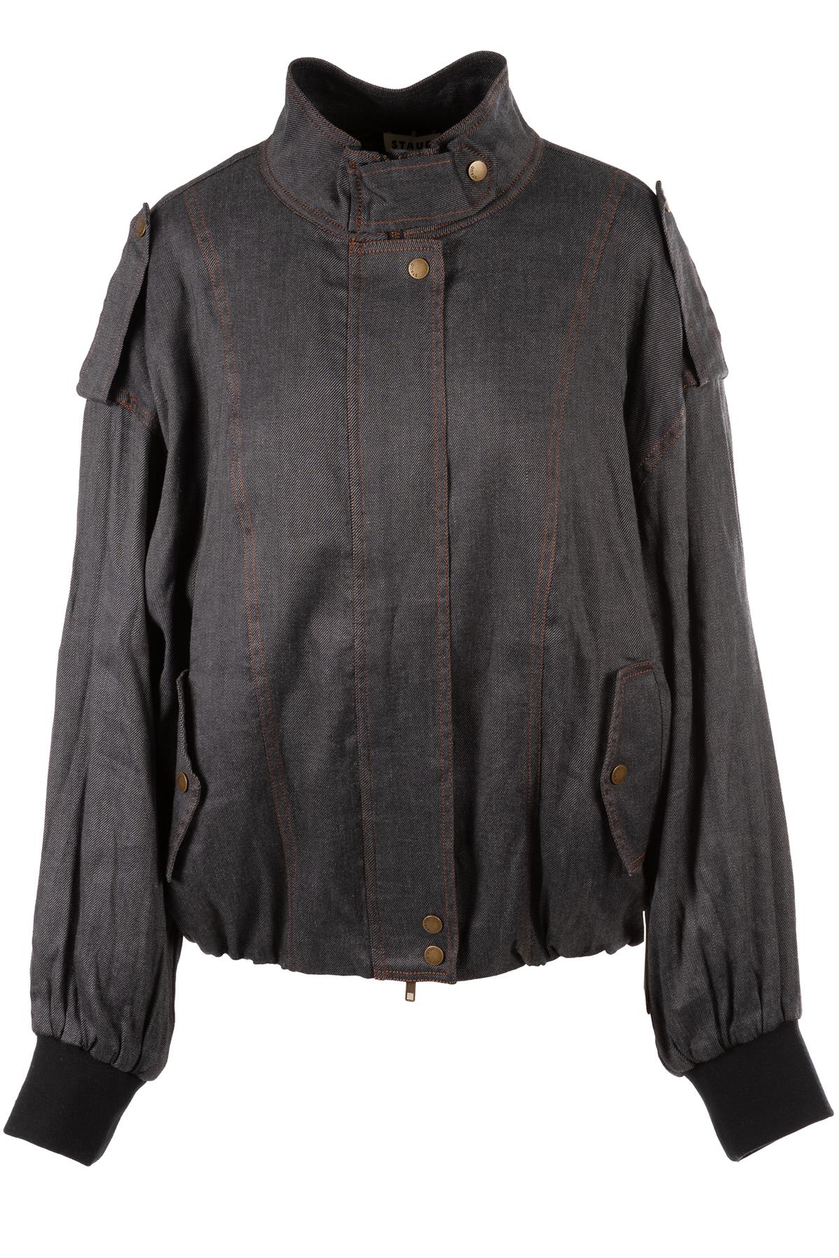 Staud Navy Denim Jacket. Navy. Long Sleeve. Mock Neck. Zip fastening - Front. 98% Cotton, 2% Elastane, 100% Polyester. Small (UK 8, US 4, FR 36, IT 40). Bust: 54 in. Waist: 48 in. Hips: 36 in. Length: 26 in.
